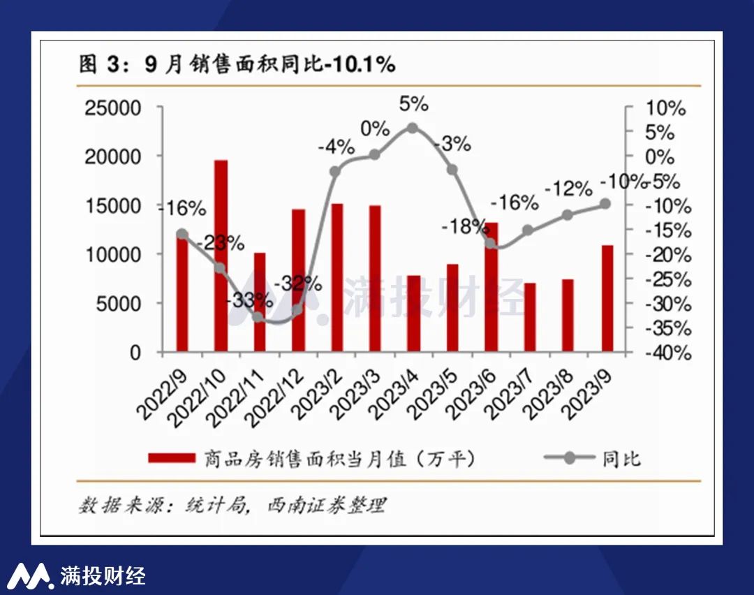 根据国家统计局数据,2023年1-9月全国商品房累计销售面积84806万平方米,同比下降7.5%,降幅较上月扩大0.4pct;9月单月销售面积为10857.38万平方米,同比下降10.14%,环比提高47%。2023年1-9月全国商品房累计销售额89070亿元,同比下降4.6%,降幅较上月扩大1.4pct。