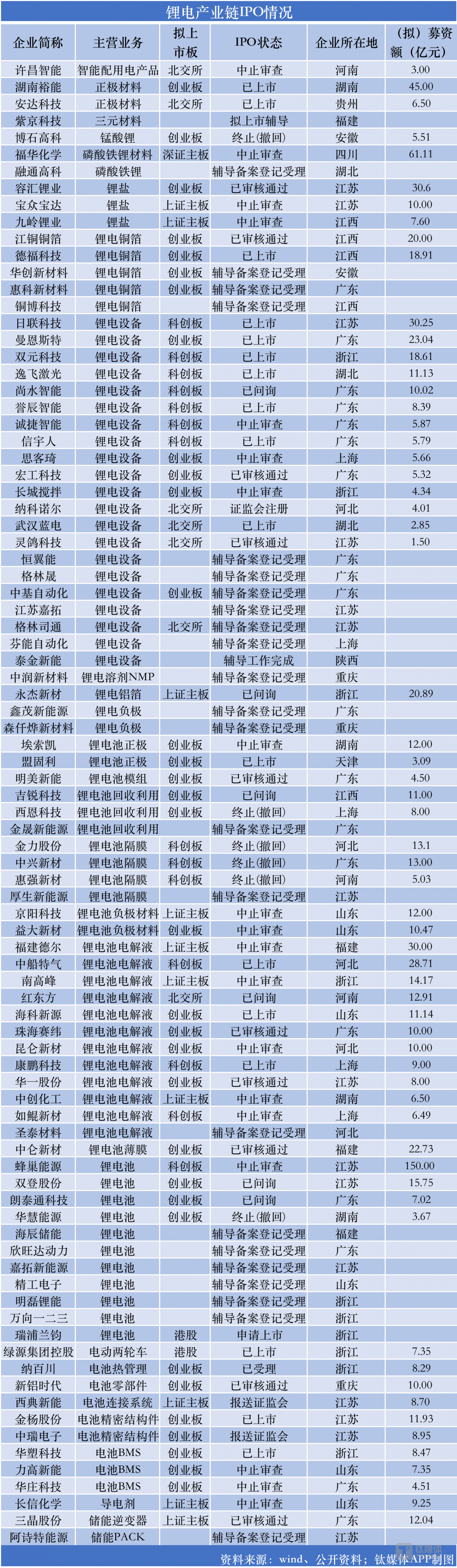 钛媒体APP根据wind数据和公开资料粗略统计,今年以来共有88家锂电产业链上的企业发力IPO。其中,17家成功上市,13家已过会,27家在排队中,25家拟/进入上市辅导;另有6家终止(撤回)。