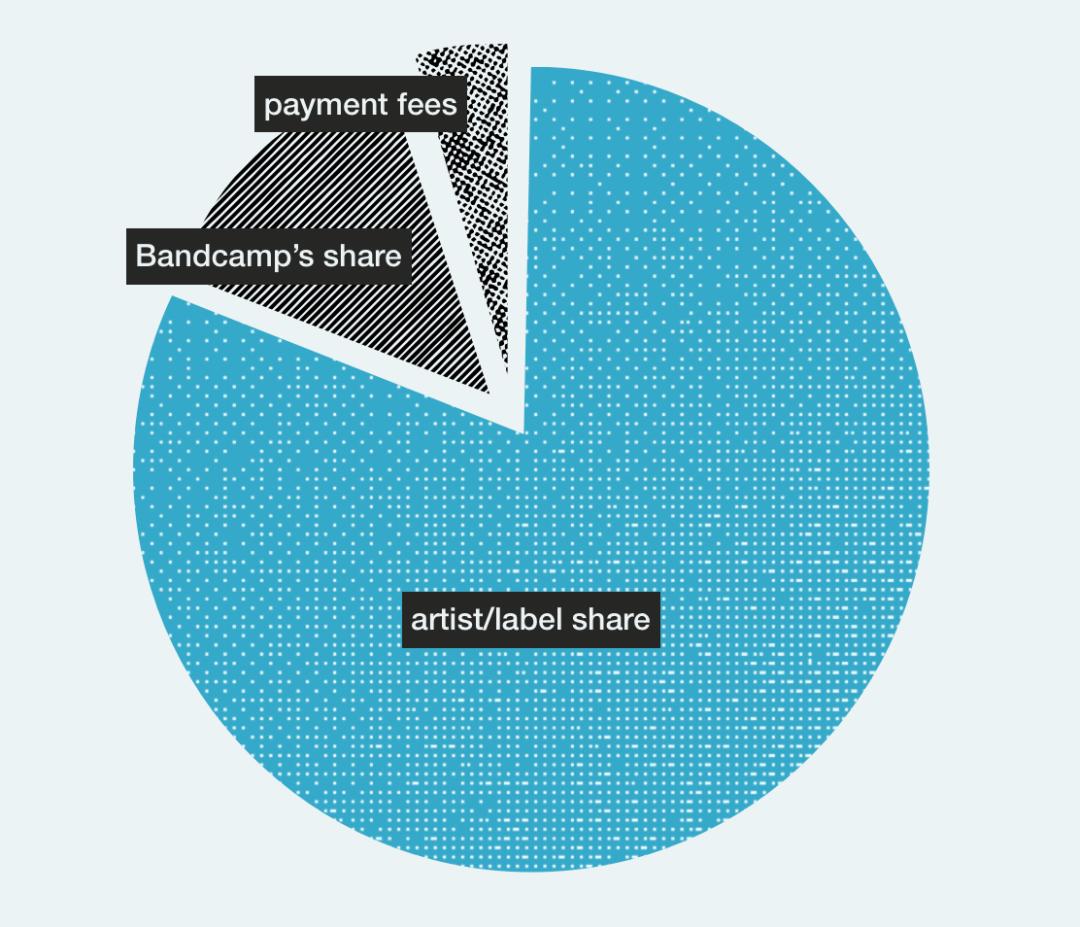 成立之初,Bandcamp就打出了“只在音乐人赚钱之后盈利”的口号,并在2010年开始采用其标志性的收入分成模式:平台从音乐人的作品销售中抽取佣金,数字作品抽15%,实体作品抽10%,当音乐人的历史销售额超过5000美元时,数字销售佣金降为10%。抽完佣金后,剩余全部金额(平均约82%)通常会在24-48小时内通过支付软件直接流向创作者。
