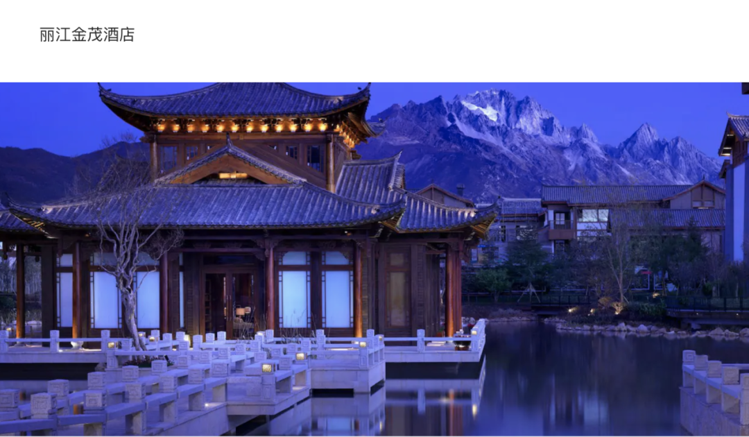 丽江金茂凯悦臻选酒店是亚太地区首家凯悦臻选酒店,酒店坐落于丽江古城核心区域,与J.LIFE精品商业区及高级别墅区相连,紧邻束河古镇。其以玉龙雪山为背景,由10栋建筑园林组合而成,拥有312间高端豪华客房,设计风格融入当地纳西民族特色与现代质感,一步一景,闹中取静,仿佛置身室外园林,既有园林审美效果,又不乏时尚气息。