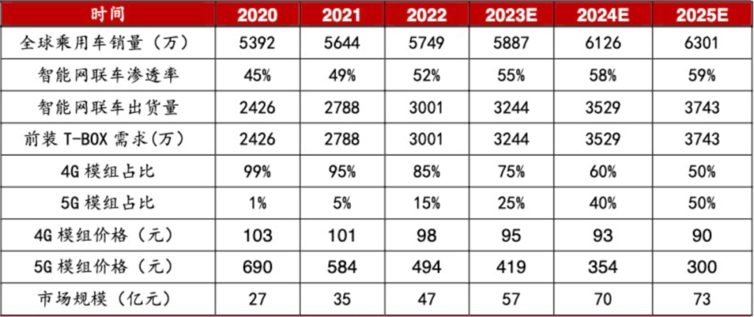 全球前装车载终端模组市场规模测算。资料来源:国联证券