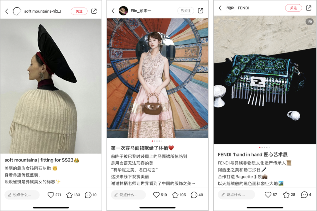 图一图二分别为以彝族文化为灵感的饰品品牌「软山」和设计师林栖设计的马面裙;图三FENDI 「hand in hand」艺术展上具有彝族文化特色的包袋