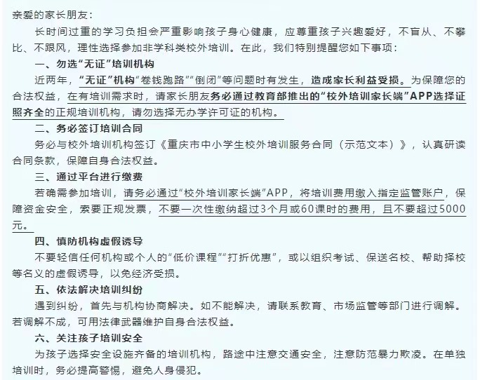 而各地也发布了相关通知和提示,“确需参加体育、文化艺术、科技等非学科类培训的,请下载使用教育部推出的“校外培训家长端”APP,查询证照齐全的合规培训机构,自觉远离无证培训的学科类、非学科类机构。务必通过“校外培训家长端”APP完成培训缴费,支付培训费用要遵守限额和时段要求,一次性缴费不超过3个月或60课时,且不超过5000元,缴费前主动签订《中小学生校外培训服务合同(示范文本)》,缴费后主动索取发票作为维权凭证,防范培训缴费风险。”
