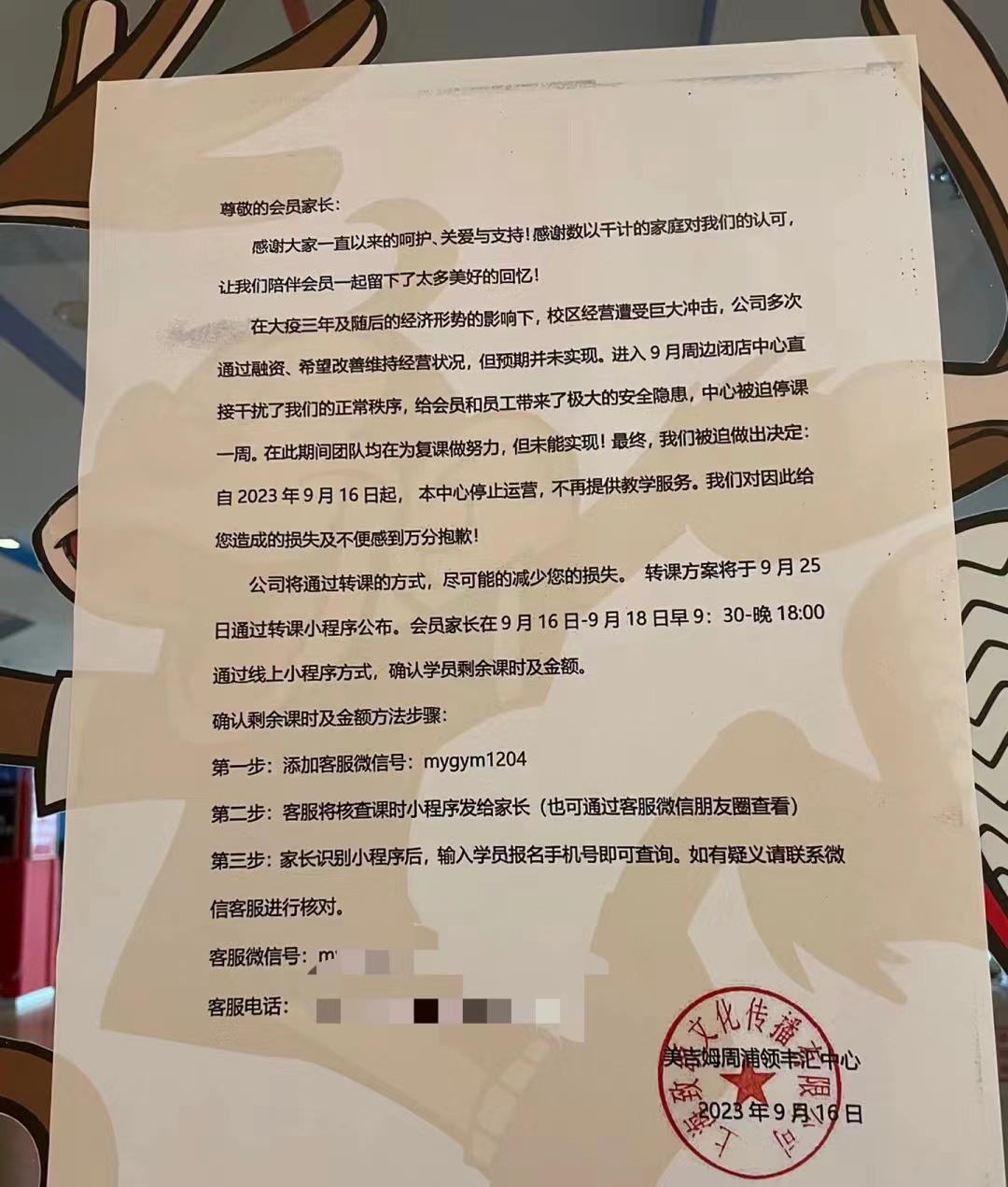 “在大疫三年及随后的经济形势的影响下,校区经营遭受巨大冲击,公司多次通过融资,希望改善维持经营状况,但预期并未实现……最终我们被迫做出决定:自2023年9月16日起,本中心停止经营,不再提供教学服务。”