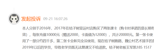 其中,在黑猫投诉平台,目前与“桔子树”相关的投诉有600余条,直到9月,仍有不少新投诉指出“桔子树跑路”“机构各校区均已关闭”“桔子树倒闭”等。有消费者指出,“本人分别于2016年、2017年在桔子树亚运村店购买了两张课卡(购卡时承诺的是长期有效),每张充值10000元(赠送2000,卡面值为12000),共计20000元。第一张卡使用了一部分约四千多,第二张卡全新完全没使用,现在桔子树跑路,魏公村艺术接手的是2019年以后的学员,导致老学员既无法复课又不给退款。”