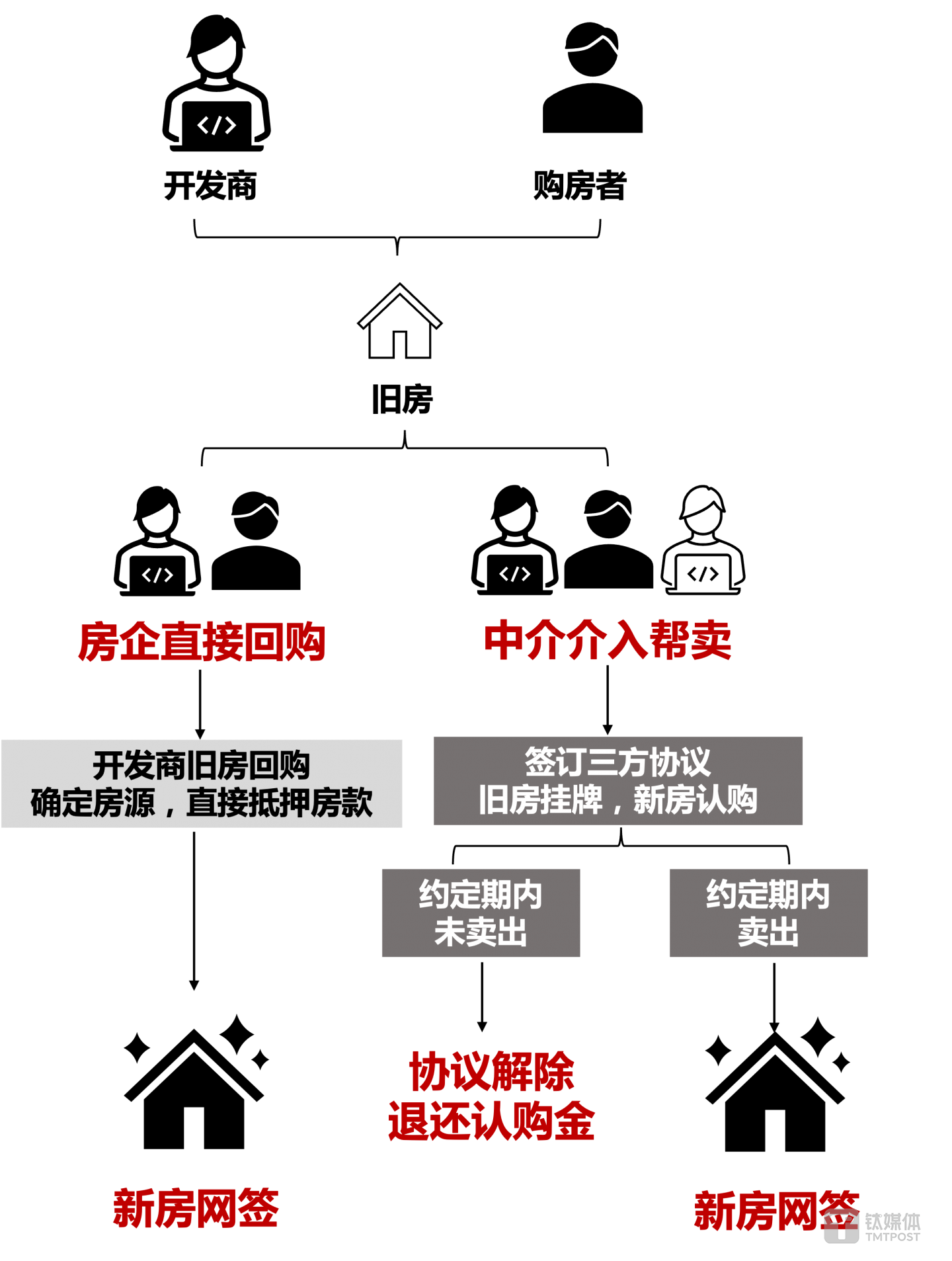 2.房企回购模式:房企或者房企寻找的第三方接手购房者的旧房,实际操作中一般是先旧房评估,旧房过户给房企,房企再将该房抵押给银行获得贷款,贷款作为旧房房款划给购房者用作新房房款抵扣金。其中海宁市鼓励房企购买意向购房人的存量房,给予房企总购房款2%的财政补贴;扬州新能源房屋开发公司在房交会上也提供两种选择方式,分为“直接置换”和“委托置换”,其中的“直接置换”就是房企收购购房者存量房,购房者购买新房该政策购房者无须等原有房屋卖出即可购得新房。