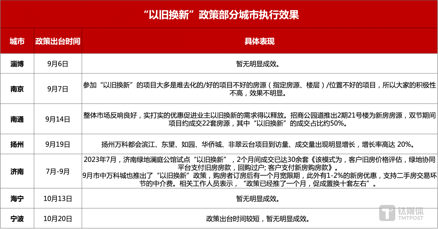 除此之外,部分城市针对“以旧换新”给予差价补贴也取得了相对不错的成效,这种“以旧换新“的交易成本跟自己去操作置换相比,可以得到政府给予的总房款1%-3%的补贴,甚至在南通出台了购房者旧房可低于市场价出售,降价部分(最高20万元)由招商蛇口进行补贴,与贝壳合作,卖旧换新1%好赞补贴等。例如9月济南万科城也推出了“以旧换新”政策,购房者订房后有一个月宽限期,此外有1-2%的新房优惠,支持二手房交易环节的中介费,政策已经推了一个月,促成置换十套左右。