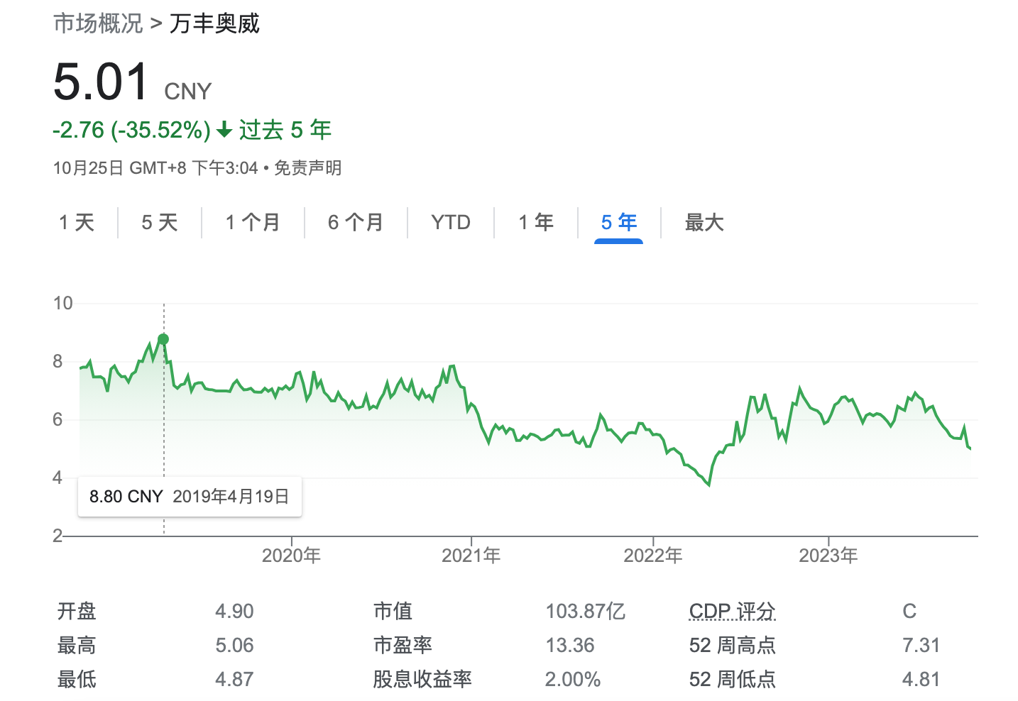 或许是对万丰奥威频繁收购控股股东资产后的发展并不看好,近年来,万丰奥威股价持续低迷,目前股价处于近一年低位,截至今日收盘,收于5.01元。(本文首发于钛媒体APP,作者|张孙明烁)