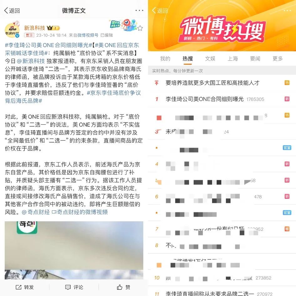 虽然李佳琦所属机构美ONE很快做出回应,称“纯属躺枪,底价协议系不实消息”,但相关讨论仍在持续发酵,#李佳琦直播价的低价协议合理吗##美ONE合同细则曝光#等多个话题先后登上热搜。