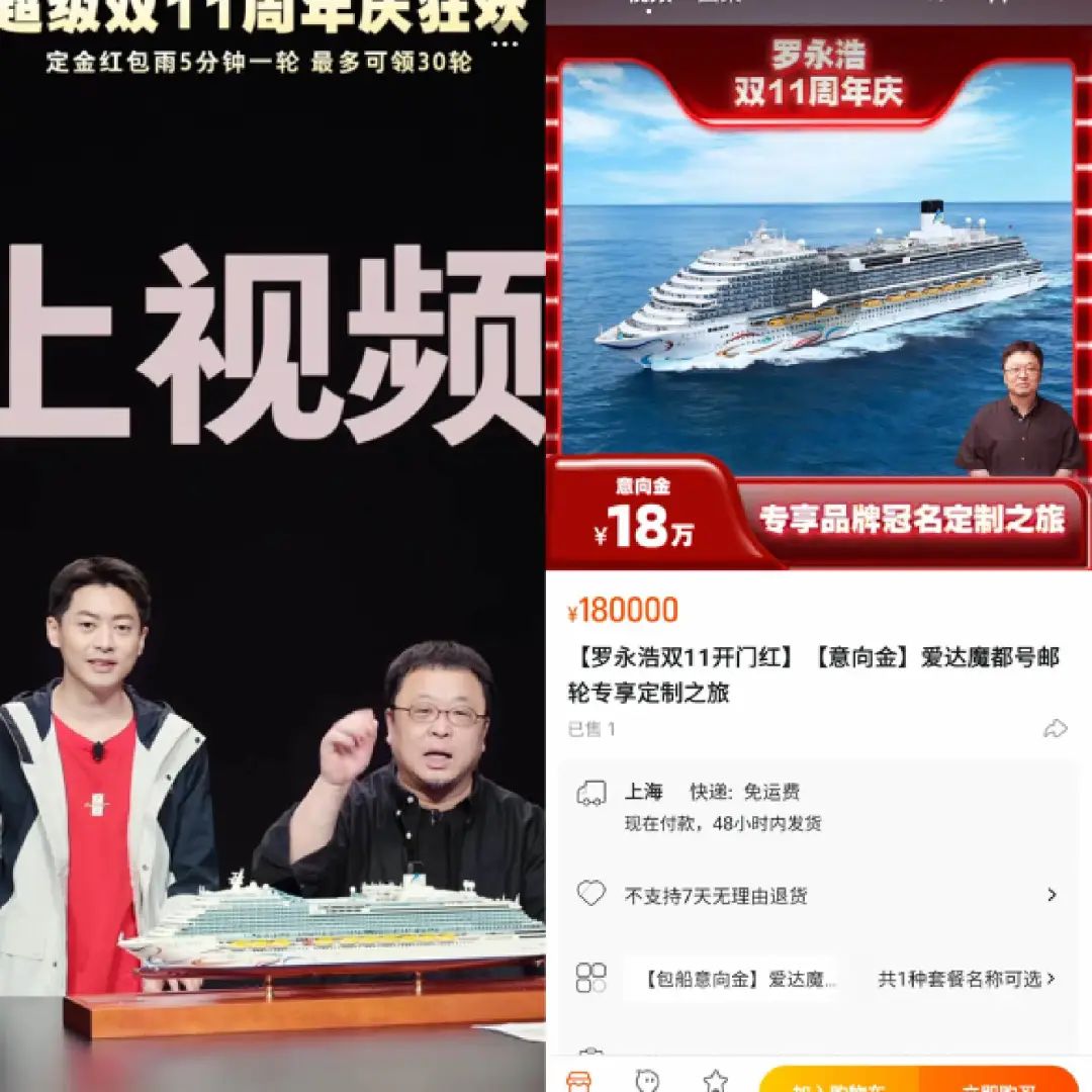 今年三月底,罗永浩曾在淘宝直播间卖出一颗价格为100万元的卫星,5月底在京东卖出了一套折后价205.23万元的杭州公寓。昨晚,最贵单品的记录被打破,“整包大型邮轮爱达·魔都号5天4晚”的链接出现在他的直播间,售价为2000万元,截至发稿前,这款需要付18万订金的商品已经卖出了1份。