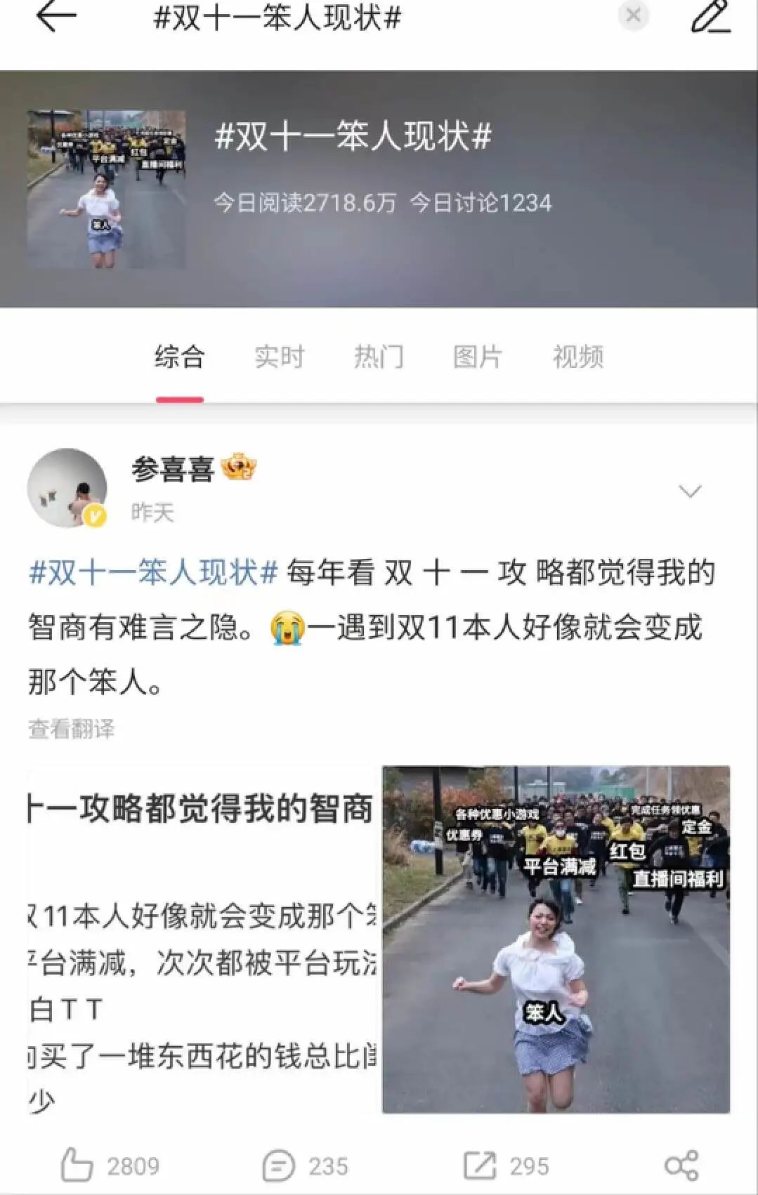 网友们和罗永浩一样,穿梭在各大平台之间。看惯了套路的网友们,已经对“低价”之外的玩法提不起太大的兴趣,在#双十一笨人现状#的热搜下,仍然有网友表示会被各种满减和福利绕晕。