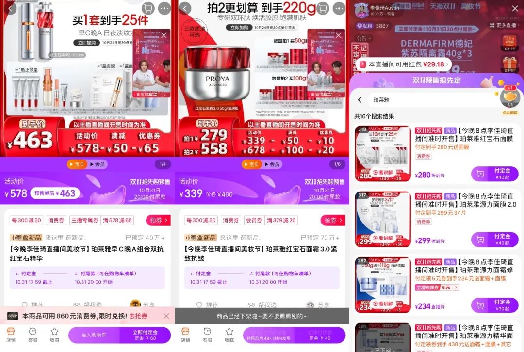 “老朋友”珀莱雅给到了16种sku组合,5款产品的销量超过10万件,红宝石面霜3.0以279元的单价卖出了70万件,李佳琦说“连仓库都卖光了”,单链接销售额近1.9亿元。早C晚A精华组合紧追其后,卖出了40万件。