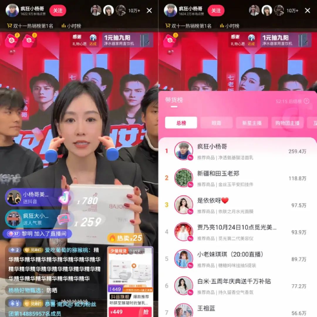 “疯狂小杨哥”在双十一和旗下主播“七老板”开启美妆节直播。小杨哥曾在直播中提到,“七老板”在护肤行业有十几年的经验,签约时粉丝仅有20多万,一个月带货几十万元,如今她的粉丝超过500万,9月带货销售破亿元。