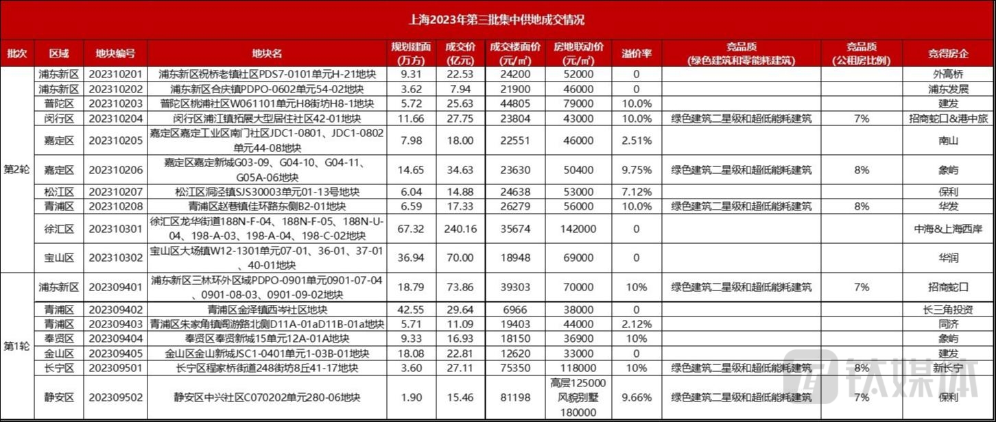 上海第三批次土拍中,多宗地块房地联动价较周边新盘及近两年出让地块均有所提升。