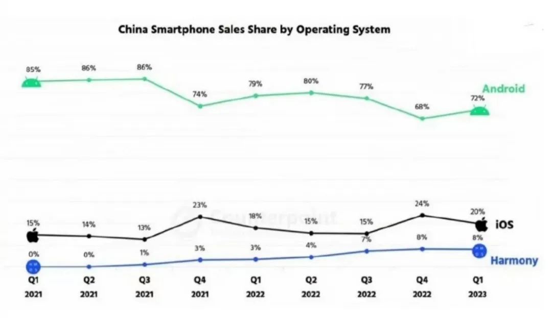 根据调研机构Counterpoint发布的数据显示,今年第一季度,鸿蒙OS在中国市场的份额提升至8%,iOS为20%,安卓为72%;而在全球市场,鸿蒙OS的份额为2%,iOS和安卓则分别为20%和78%。