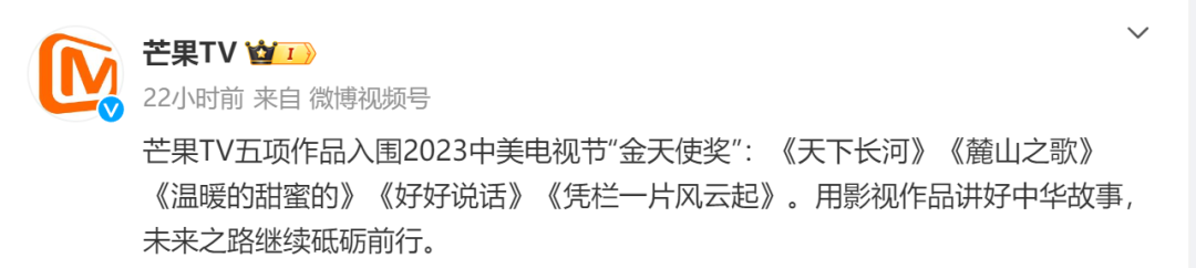 10月23日晚7点,芒果TV官方帐号发博,称“芒果TV五项作品入围2023中美电视节‘金天使奖’”,但网友关注度并没有很高,该电视节奖也无官方微博账号运营,主要的信息都来源于官方的微信公众号。