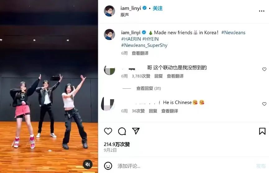 除此之外,林一本人的形象气质也颇受韩国用户欢迎,自拍内容基本条条近百万点赞。清楚自身优势及受众偏好的林一及其团队,最新的一条帖子就是与韩国大热组合new jeans成员合拍舞蹈视频,点赞超过200万,评论区将其称之为“梦幻联动”。