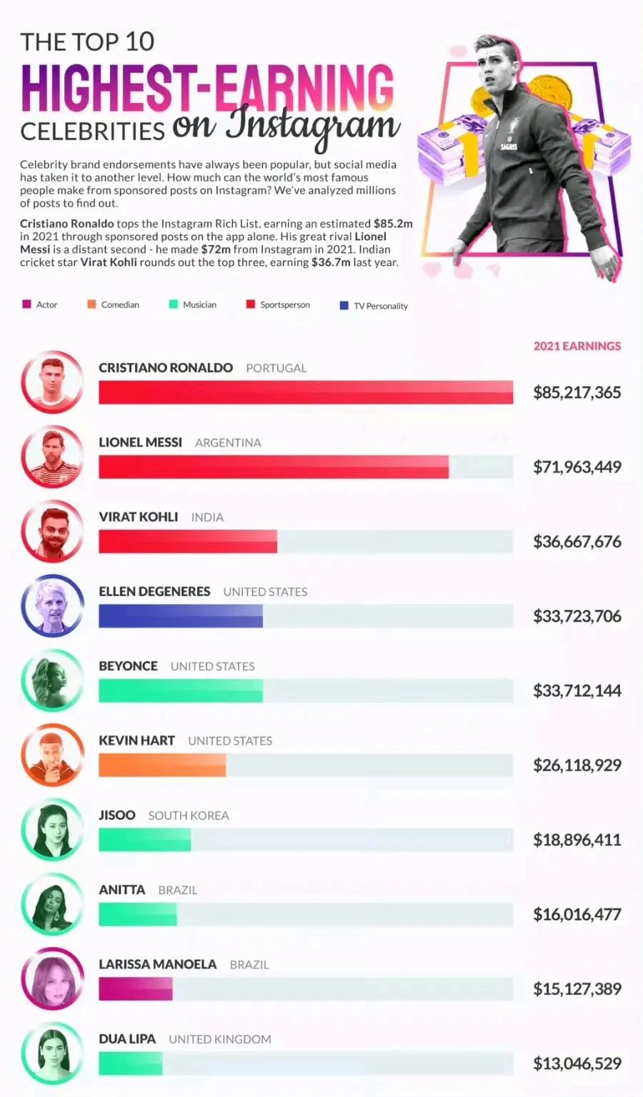根据NetCredit2021年发布的Instagram最赚钱明星排行榜显示,ins上前十位最赚钱的明星分别是葡萄牙足球运动员C罗、阿根廷足球运动员梅西、印度板球运动员Virat Kohli、美国电视主持人Ellen DeGeneres、美国歌手碧昂斯、美国演员凯文·哈特、韩国组合blackpink成员金智秀、巴西女歌手安妮塔、巴西艺人Larissa Monela、英国歌手Dua Lipa。