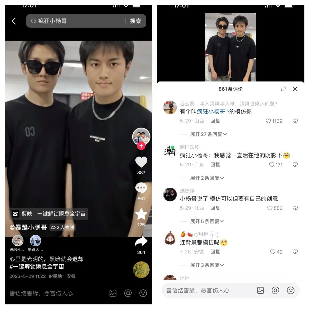 “明星平替”现象愈演愈烈,现在甚至已经发展出模仿头部达人的案例。作为@疯狂小杨哥 的像素级模仿者,@暴躁小鹏哥 的视频背景与创意都与@疯狂小杨哥 如出一辙。有网友辣评“疯狂小杨哥乞丐版”,“模仿没有错,他1:1照搬”,还有网友反讽到“有个叫疯狂小杨哥的模仿你”。