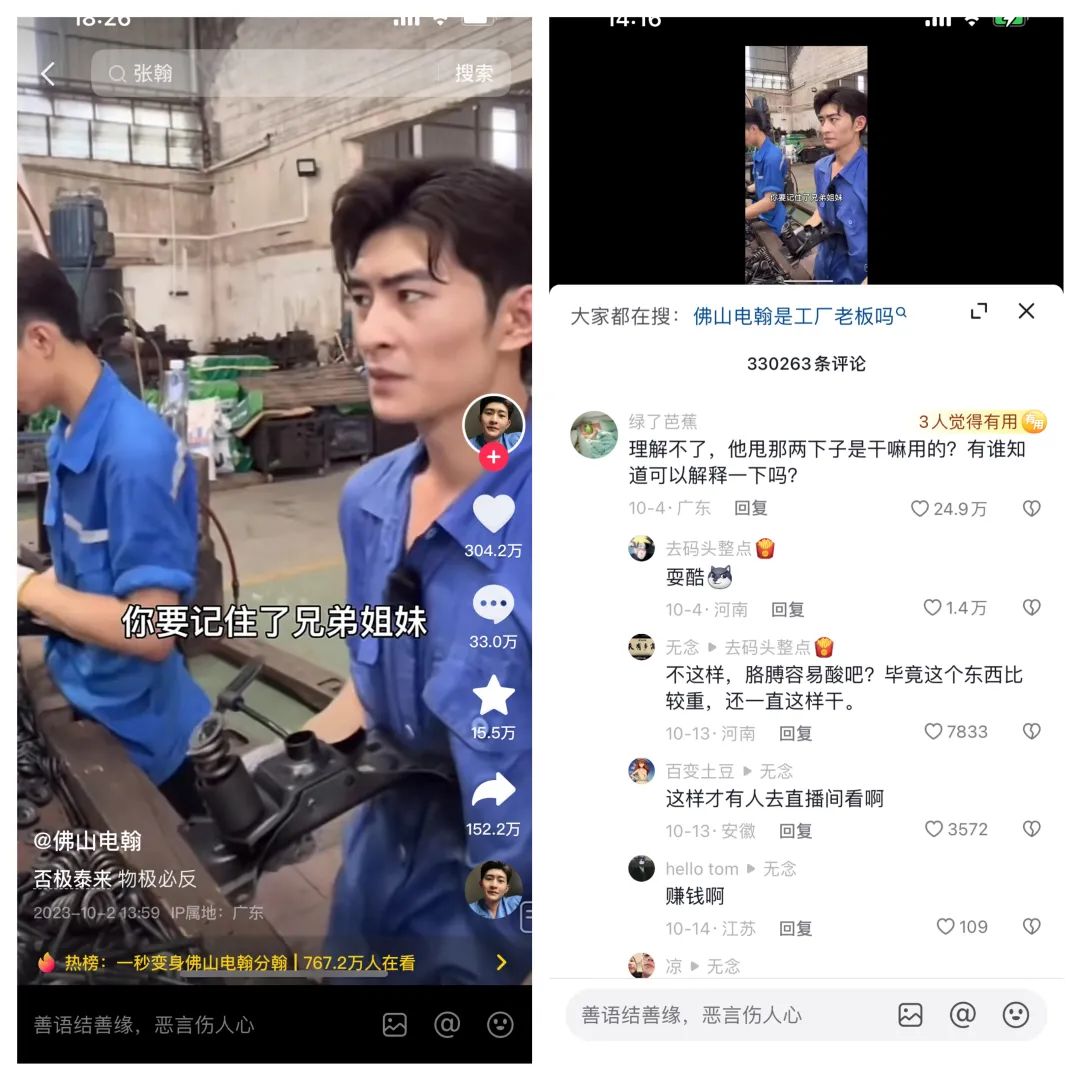 据了解,早在2020年,@佛山电翰 就曾接触直播,但当时他并没有特色,直播间也没有几个人观看,赚钱更是无从谈起。朋友看他直播碰壁,就帮他找了份工厂兼职的工作,在工厂打螺丝的时候,他抱着“两不耽误”的心态开启了直播。