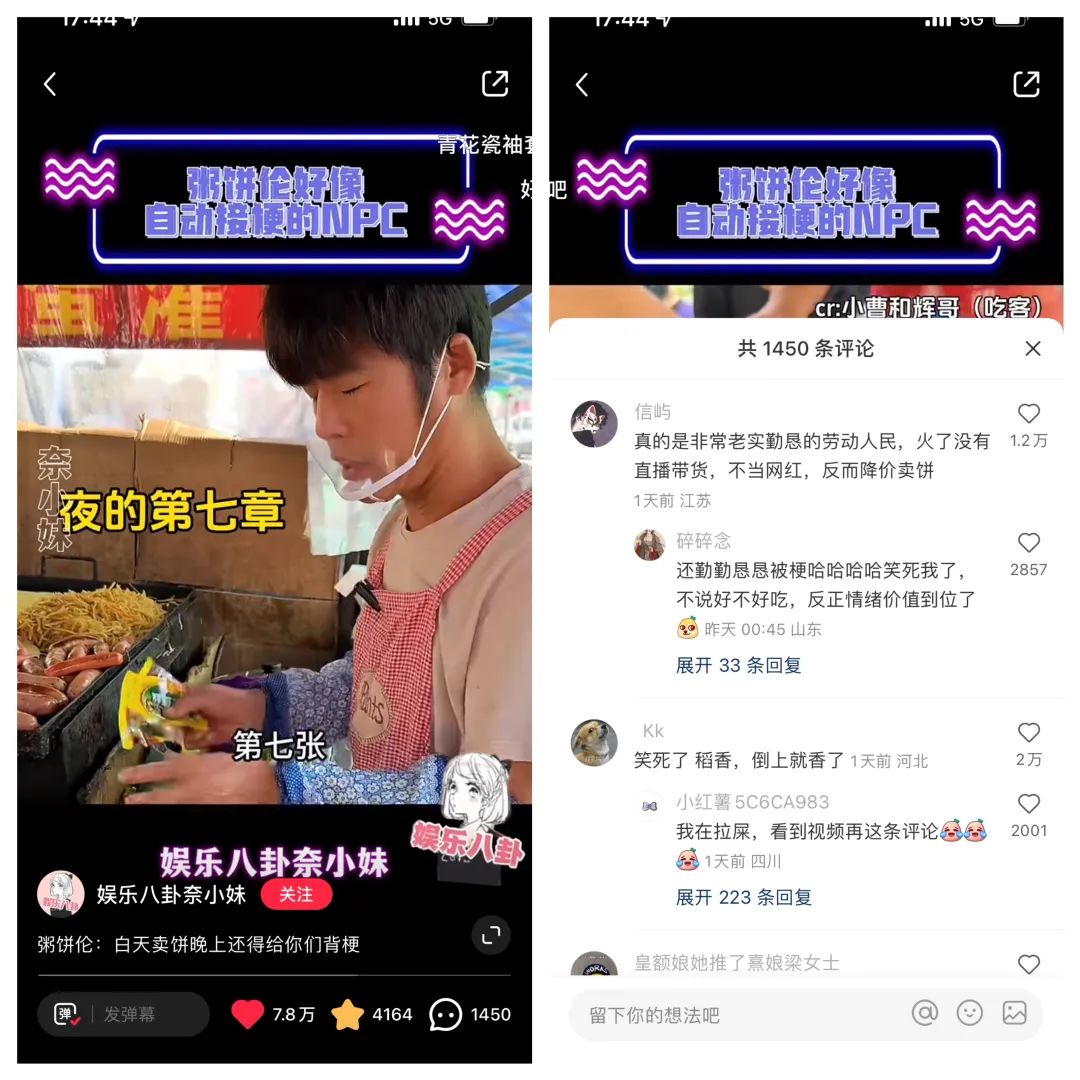 有人是刻意模仿明星,有人则是凭借与明星相似的外形“被迫”出圈。“粥饼伦”火了之后白天继续卖煎饼,晚上背周杰伦的歌词梗。“做饼需要多上时间?一首歌的时间”,“不能说的秘密都给你加进去”,“这是第几张饼,夜的第七章”……