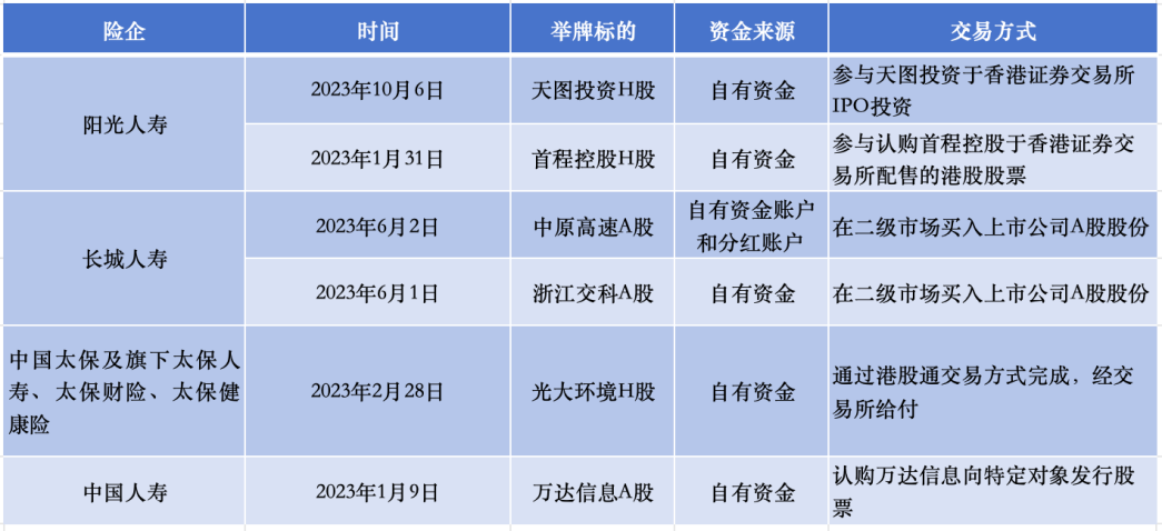 今年险资主动举牌上市公司次数已经超过2022年全年。具体来看,今年1月,中国人寿增持并举牌万达信息,增持完成后,中国人寿及一致行动人国寿集团合并持股从18.17%上升至20.32%;1月31日,阳光人寿认购港股首程控股配售股份,获配股数为2.53亿股,与一致行动人合计持股6.05%;而在近日阳光人寿再次举牌,其发布公告称,认购天图投资IPO股份1205万股,占该上市公司香港流通股的6.95%,触及举牌。