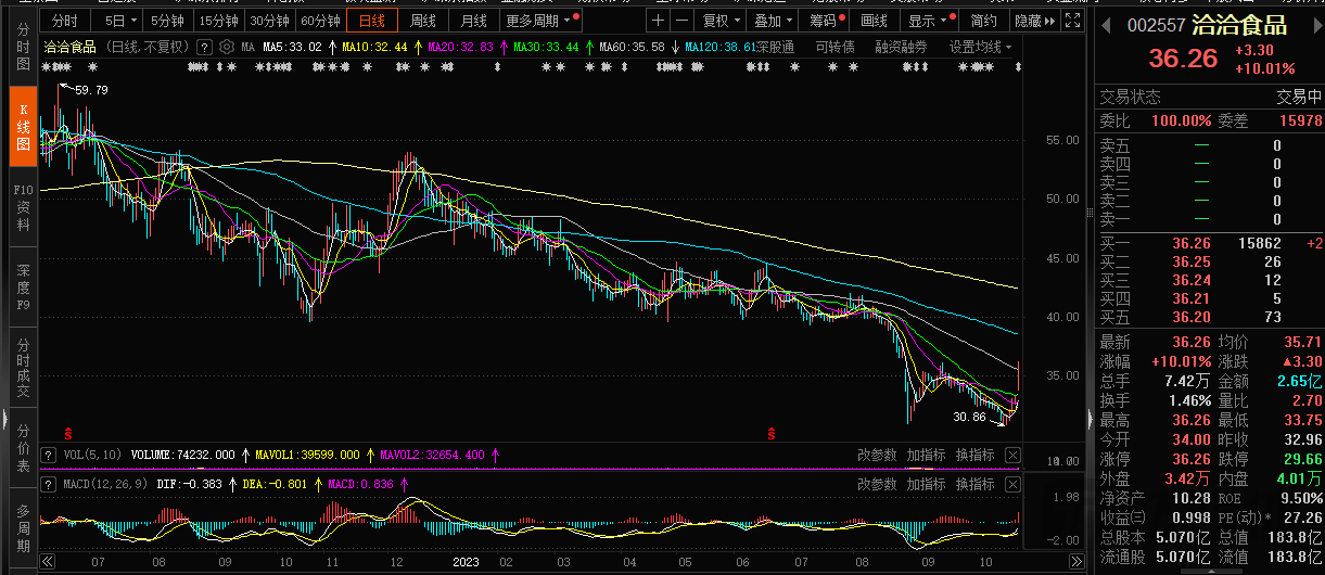 虽说三季报增收不增利,但近期洽洽食品股价强势上涨。10月27日股价涨停,当日洽洽食品收36.26元,涨幅为10.01%,总市值为183.8亿元。