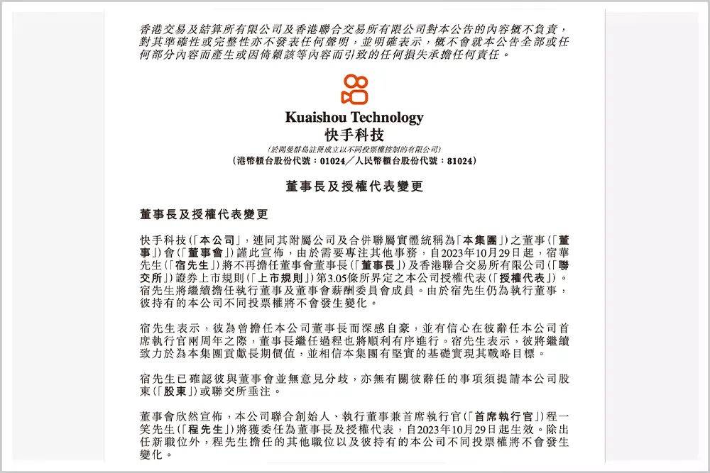 2023年10月20日,快手科技宣布宿华正式辞任董事长,由CEO程一笑兼任。至于调整原因,快手在公告中称,(宿华)需要专注其他事务。