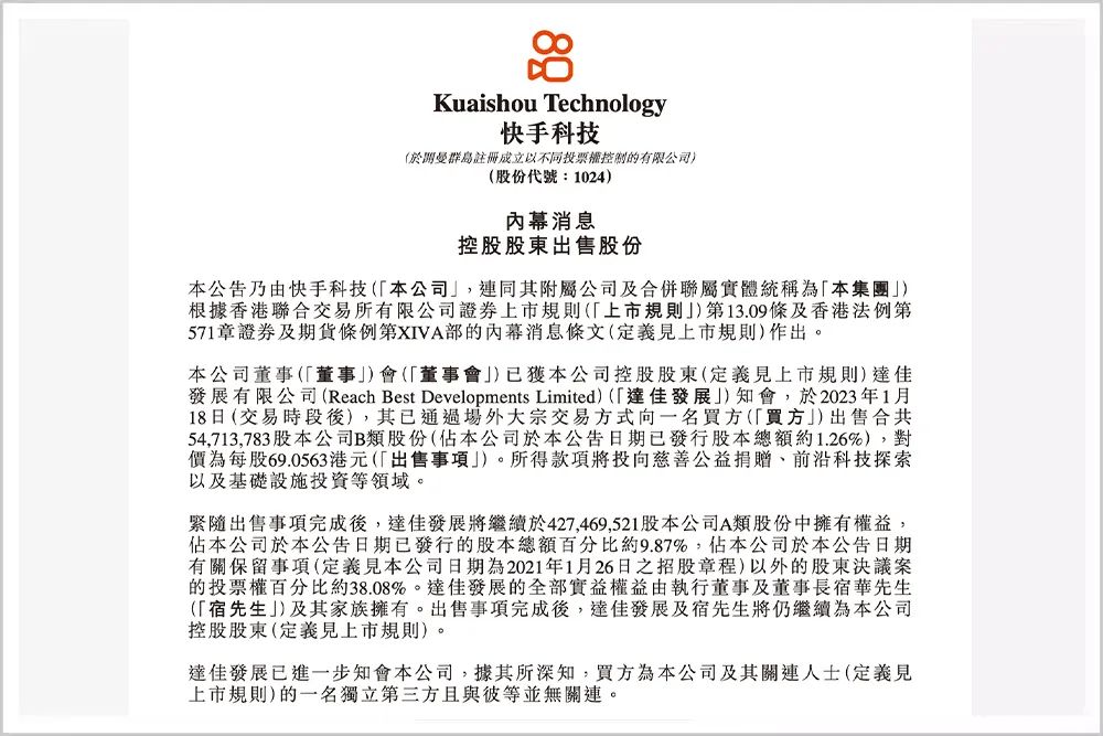“其他事务”是什么?今年年初,还是快手董事长的宿华曾有过一次大手笔减持,预计套现37.78亿港元。在公告中,快手表示,宿华减持所得款项将用于慈善公益捐赠、前沿科技探索以及基础设施投资等领域。