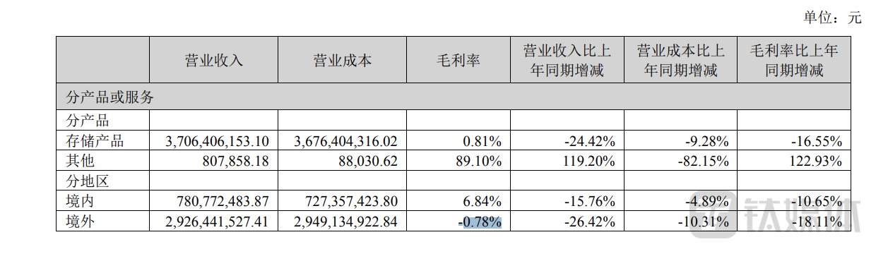 从地区上来看,江波龙的销售市场主要是面向海外,海外营收的比重超过7成。据半年报显示,今年上半年,公司的境内外收入均出现了下滑,其营收分别为7.81亿元、29.26亿元,同比下滑了15.76%、26.42%,其中境外市场的收入下滑幅度较大。