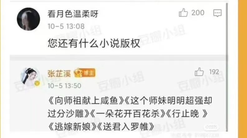 甚至于两年后,这股担忧也蔓延到了《献鱼》上。豆瓣上,不少网友因为她手里的小说版权表示自己“房子塌了”。大概唯一令人欣慰的是,在《皎若云间月》之后,张芷溪回复网友表示“后面的项目我基本都不演了”。《行止晚》微博下,她也透露“把机会留给妹妹们,我专注三界神仙的妈”。主打一个“听劝”的姐姐。