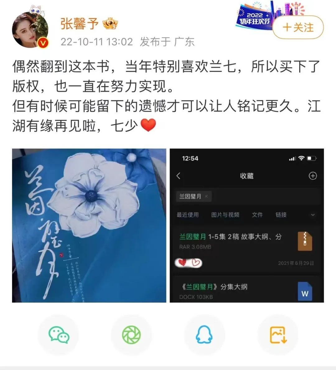张馨予的处境稍微好一些,但也有“徒做无用功”的辛酸。去年10月,张馨予在微博上发文表示曾因为喜欢买下了《兰因璧月》的版权,并为此在一直努力,但是因为版权到期的问题而难以实现。在她晒出的图片中,有准备好分集大纲、故事大纲、人物小传等。
