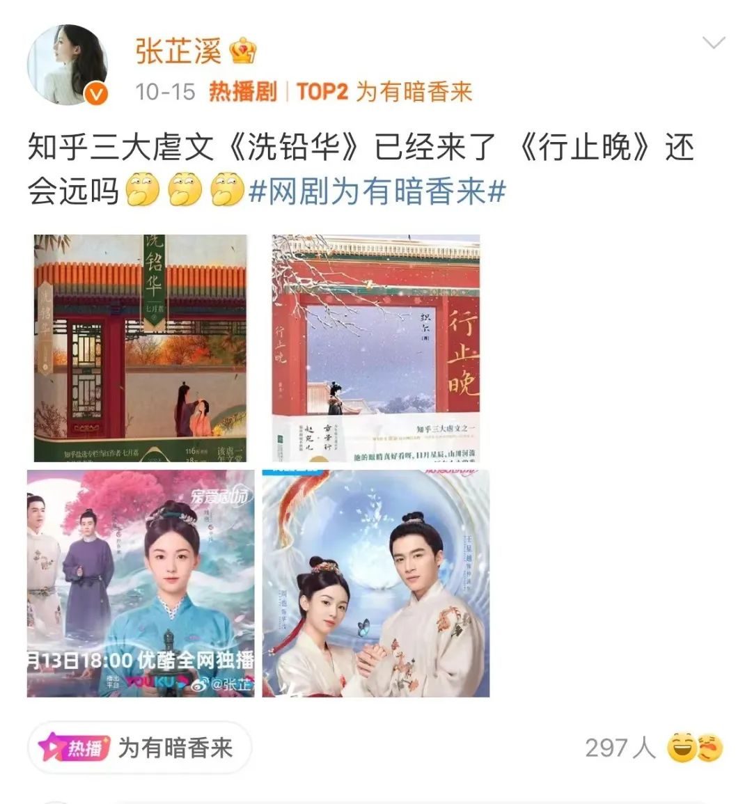 《为有暗香来》改编自知乎网文《洗铅华》,其实并未有公开资料显示张芷溪曾购买过此IP版权,反倒是2021年就有消息表示于正拿下了IP的影视化权限。不过这并不影响大众对这位“IP富姐”的认知: