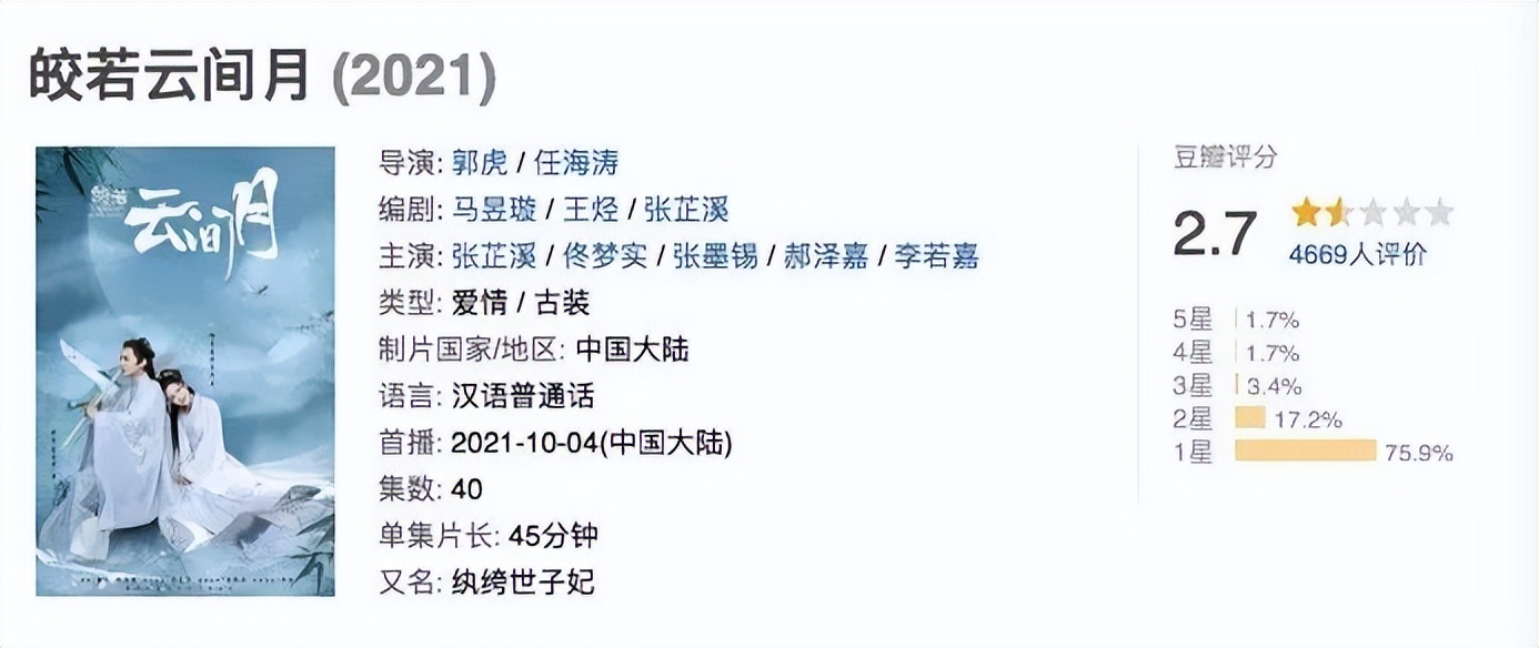 只是在这种野心之下,网友的担心同样难以掩盖。2021年,由张芷溪担任总制片、总编审、编剧的《皎若云间月》在优酷上线,原著《纨绔世子妃》加持,最终却只收获了豆瓣2.7分的评价。这也让她透露的为了该剧“连续三年每天只睡两三个小时”,有了一股越努力越心酸的味道。