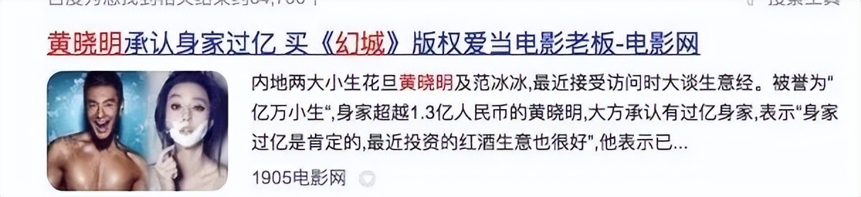 黄晓明最为人乐道的购买IP的事迹,是郭敬明《幻城》的影视化改编权,不过后来他在采访中表示因为团队执行问题而未被落实。2018年电影频道节目中心发起的“优创计划”活动上,黄晓明将自己购买的多部文学作品的影视化改编权无偿捐献,包括《城市猎人》《狐说》《此心无垠》。可见他在购买IP上,从未放松。