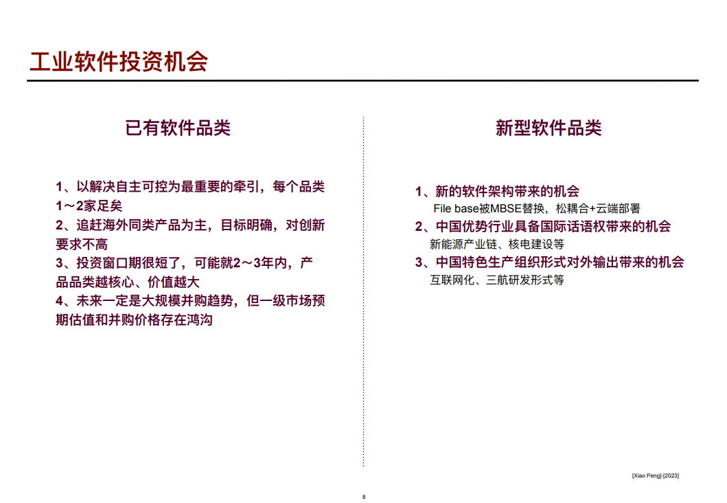 首先,对于现有的软件品类,中国的工业软件通常借鉴海外的经验,且从自主研发的角度来看,中国的工业软件市场并不成熟,也没有明显的引领地位。其次,中国工业软件企业的规模相对较小,与国际竞争对手相比,发展较弱。因此,在已有的软件品类中,自主可控作为重要的牵引因素,对于工业软件的投资机会可能更有吸引力。