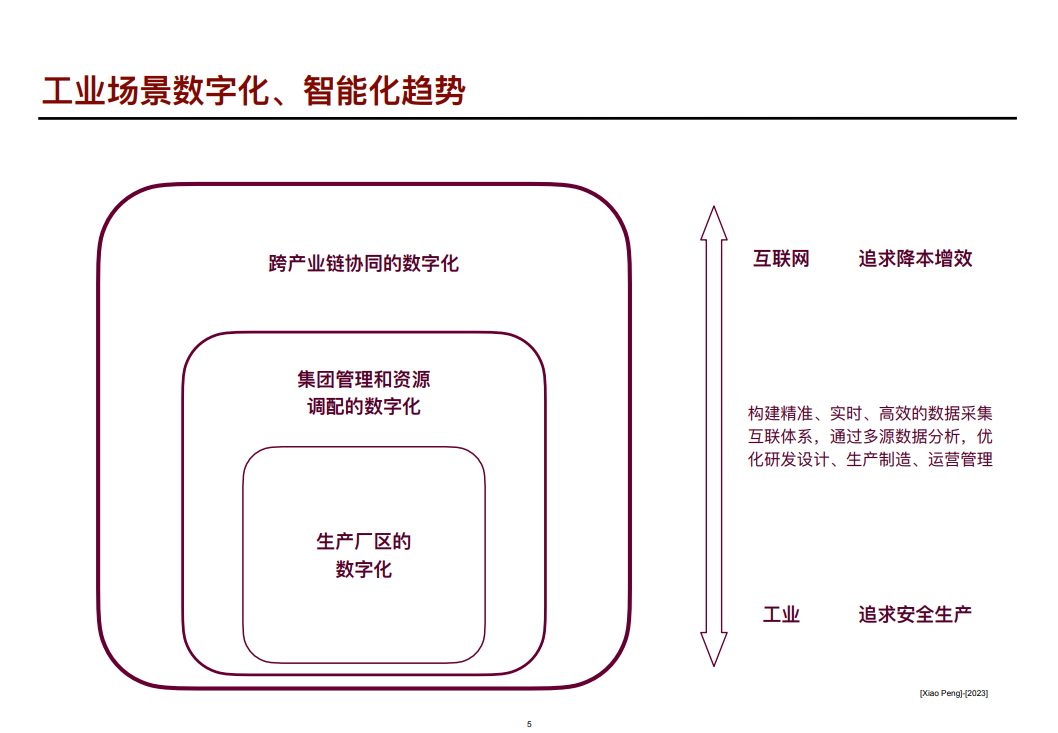 工业场景可能有两个趋势,我将讨论这些趋势以及工业场景如何与现代互联网技术相融合。在工业车间或生产场所,我们主要关注的仍然是安全和生产。因此,这一领域很难与最新的技术或软件架构相结合,因为它需要更多的安全和生产性。尽管如此,市场上也出现了一些数字化转型的一线车间产品或企业。