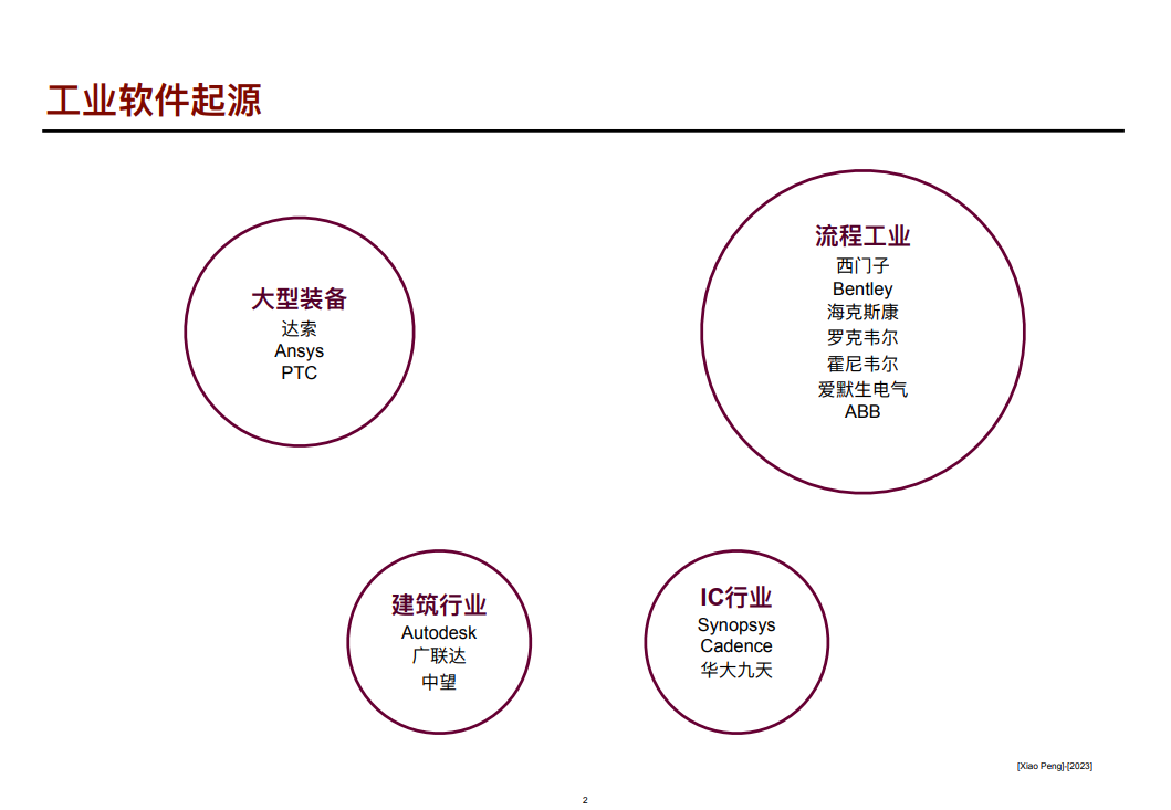 从目前的情况来看,工业软件的发展情况主要与某个国家或地区的工业能力和工业产出能力相关。例如,我们现在看到的大多数工业软件主要来自两类领域:一是大型装备的生产和制造,比如达索,他们专注于航空航天领域,制造大型飞机和军工导弹、火箭;二是流程工业:包括化工、钢铁和能源行业。汽车制造则更类似于大型装备制造,因为它最终是一个成品设备。在这个领域,例如西门子和海克斯康等公司,他们提供软硬件解决方案,也服务于流程工业。此外,如建筑业,也出现了专门为这些领域提供工业软件的公司,如广联达和中望。另一个近年来非常热门的领域是半导体行业,主要涉及EDA软件。