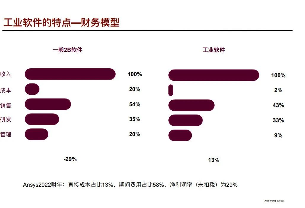 从财务模型上分析工业软件的特点。工业软件与一般的企业服务软件有两个主要不同点。第一,工业软件在研发费用占比更低。第二,工业软件在销售和客户方面更加稳定。这是因为工业软件的客户群体通常比较集中,如大型装备制造企业或工艺流程型企业。在创业初期,这一特点有助于降低销售费用。