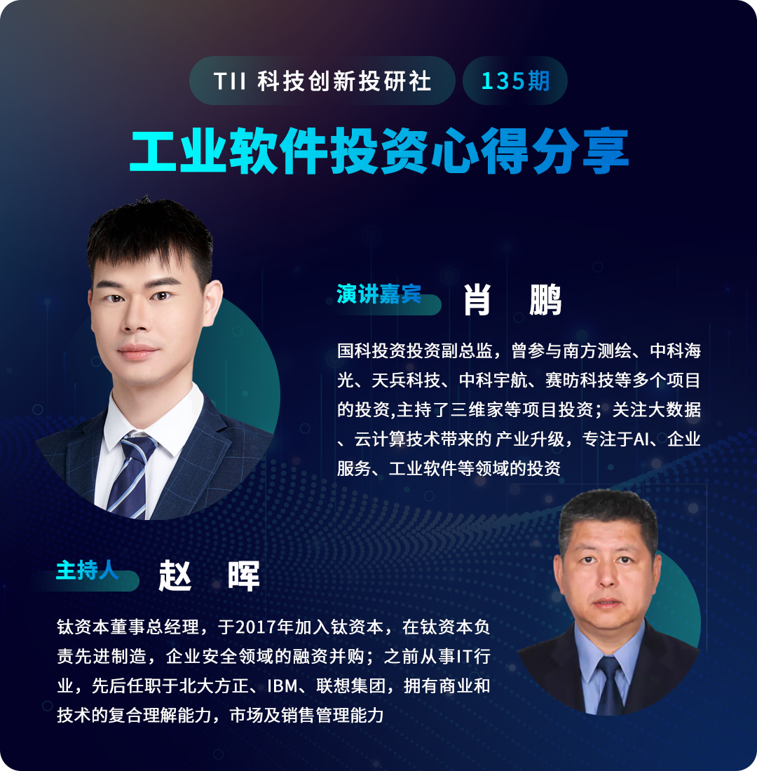 关于工业软件领域未来的发展趋势?有哪些投资机会?近期钛资本邀请到国科投资副总监肖鹏来进行分享,主题是:工业软件投资心得分享。他是东南大学硕士,2018年加盟国科投资,历任投资分析师、投资经理,现任公司投资副总监、软件组成员。曾参与南方测绘、中科海光、天兵科技、中科宇航、赛昉科技等多个项目的投资,主持了三维家等项目投资。本次分享主持人是钛资本董事总经理赵晖,他2017年加入钛资本,在钛资本负责先进制造,企业安全领域的融资并购,之前从事IT行业,先后任职于北大方正、IBM、联想集团,拥有商业和技术的复合理解能力,市场及销售管理能力。以下为分享实录: