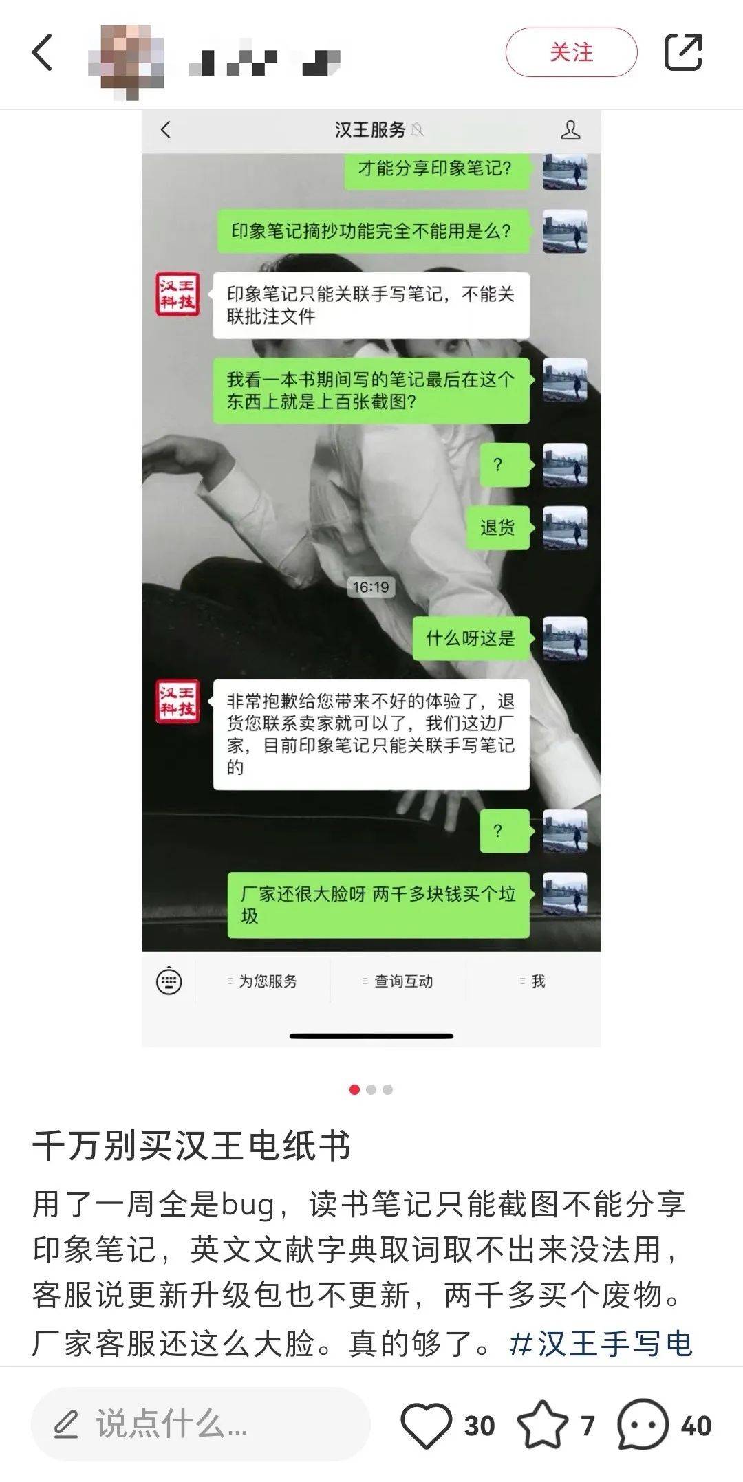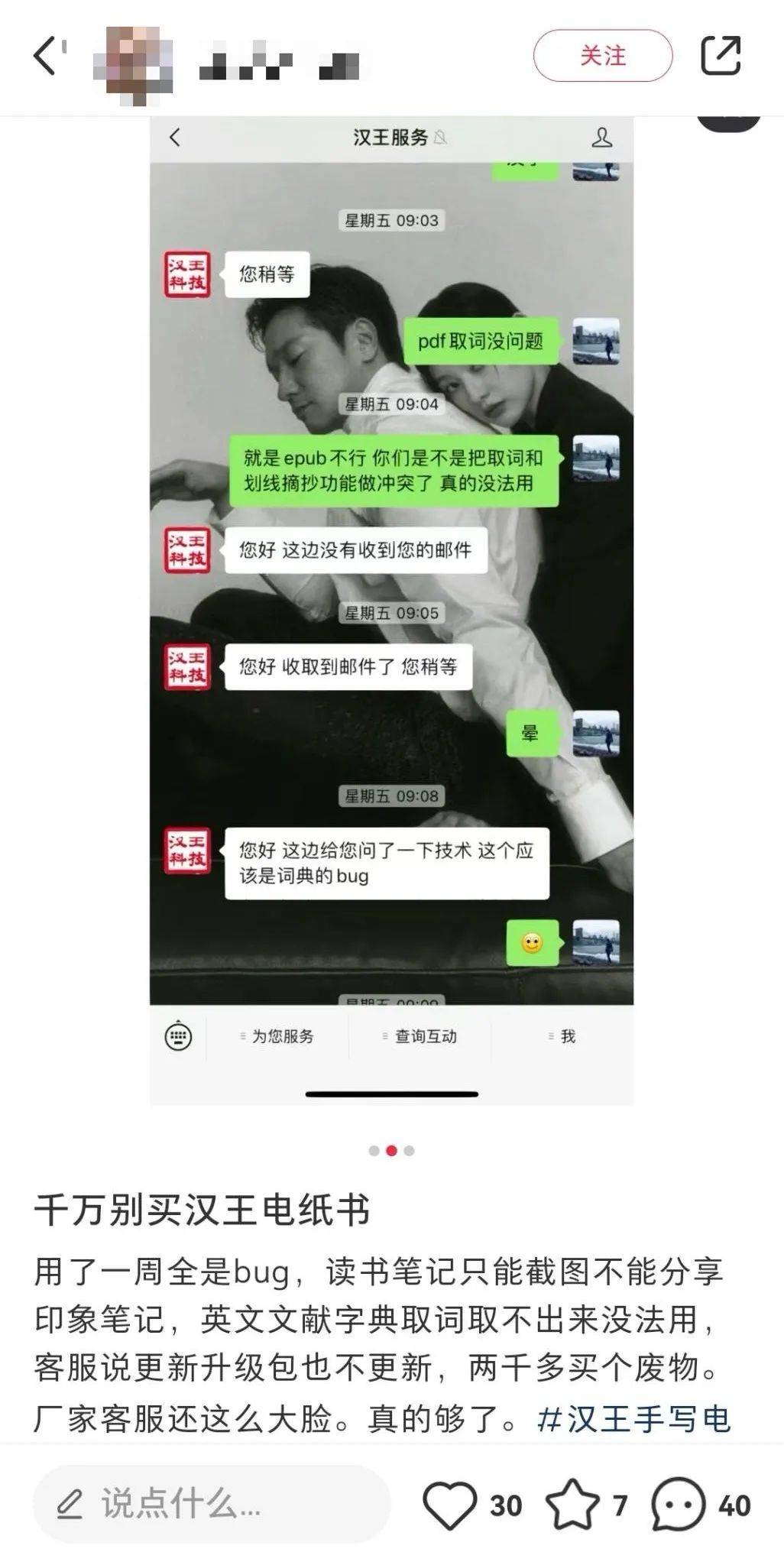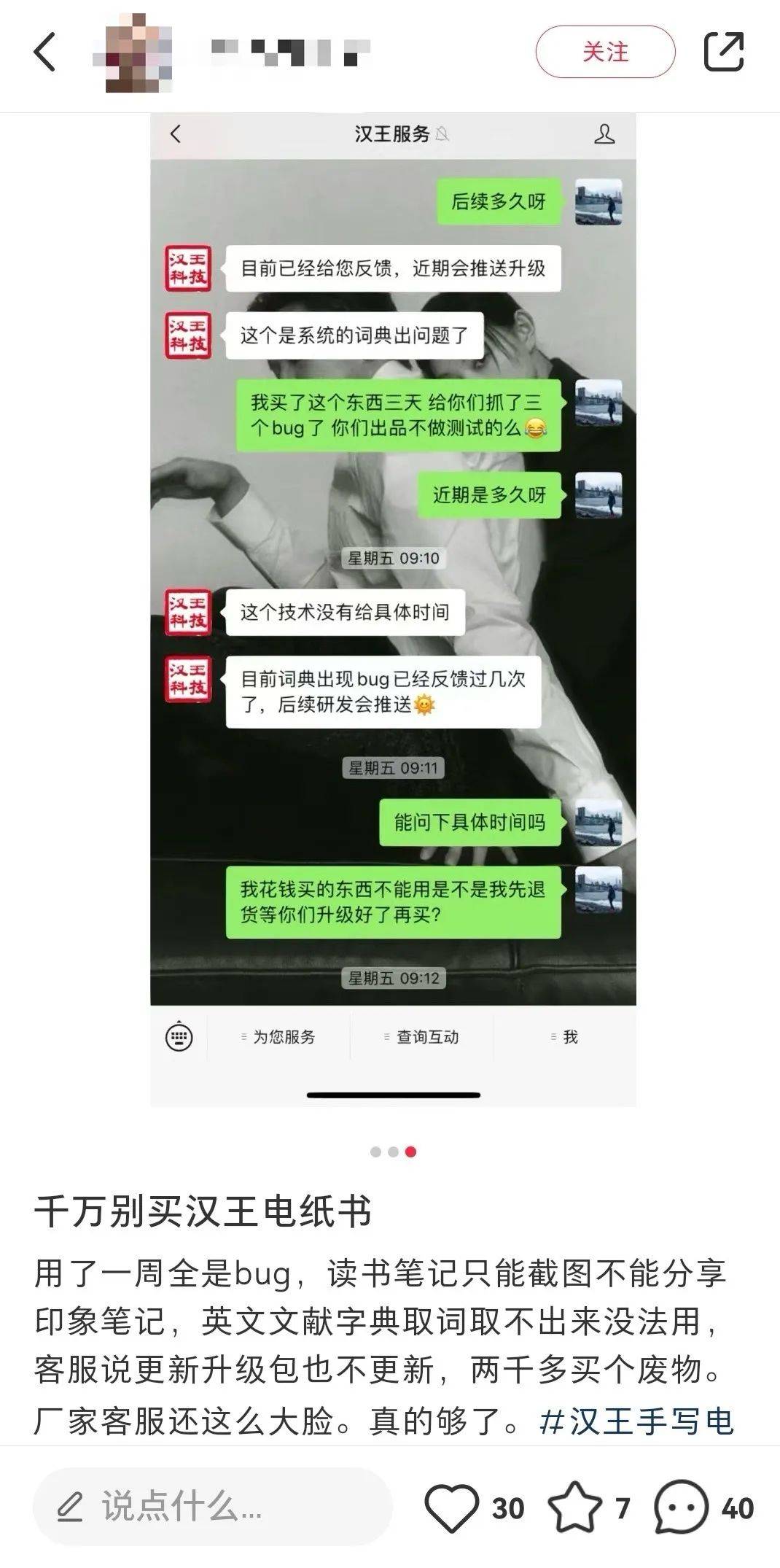 此外,记者还注意到在小红书上有用户对汉王电纸书产品出现问题的投诉,其与汉王科技的客服进行多番沟通,客服反馈产品问题的出现是由于“词典的bug”,还表示“词典的bug已经反馈过几次,后续研发会推送”。