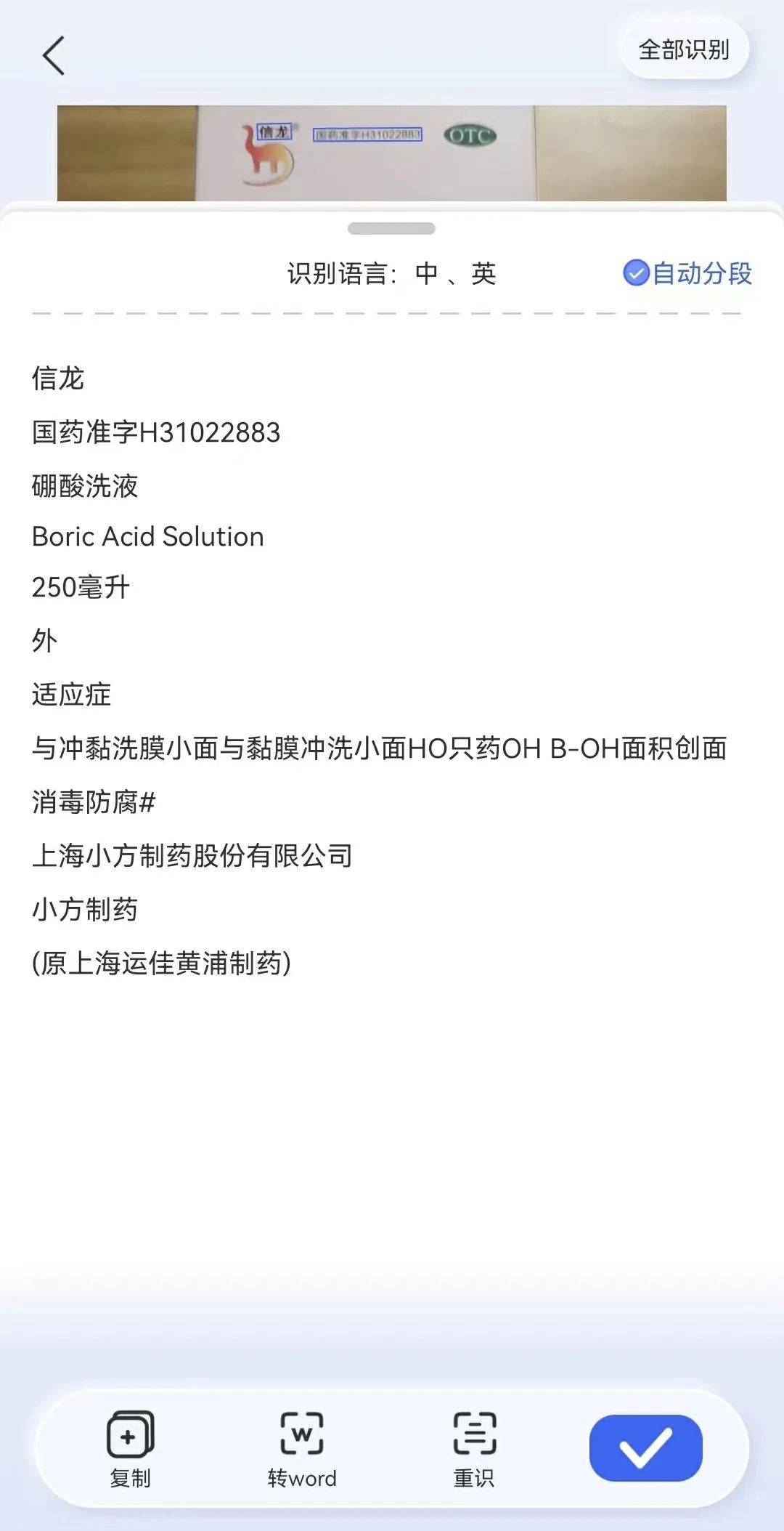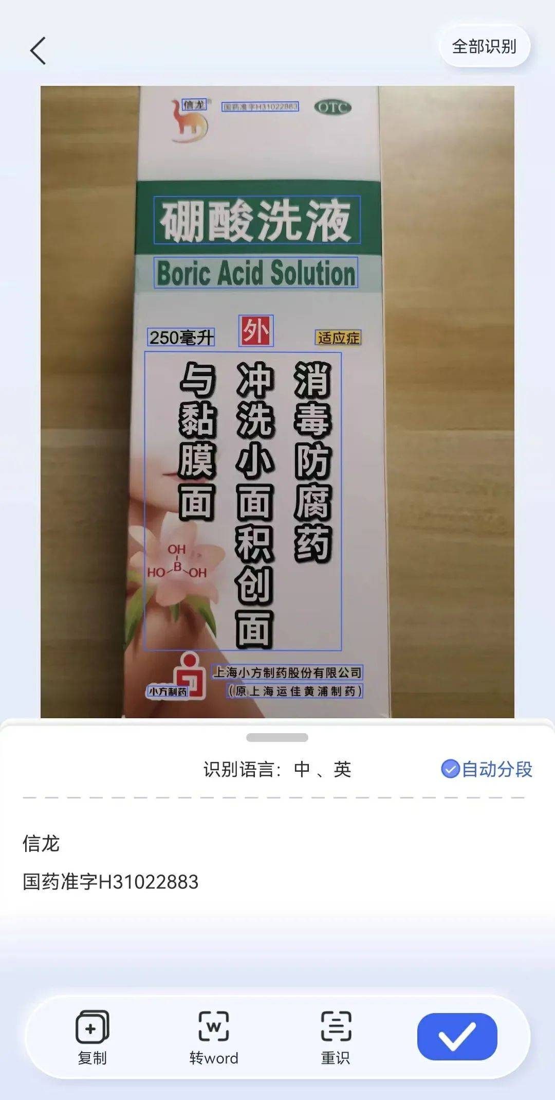 先说产品,「界面新闻·子弹财经」体验了汉王科技产品——汉王扫描王,使用该产品的“拍图识字”功能对硼酸洗液的包装外盒进行操作后,发现出来的结果与实际相差甚大,比如出现硼酸结构式被打散,文字顺序错乱等问题。