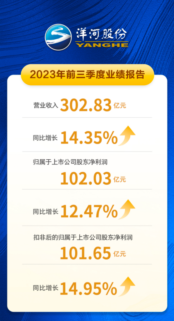10月27日晚间,洋河股份发布三季报,2023年1-9月实现营业收入302.83亿元,同比增长14.35%;归属于上市公司股东净利润102.03亿元,同比增长12.47%;扣非后归属于上市公司股东净利润101.65亿元,同比增长14.95%。