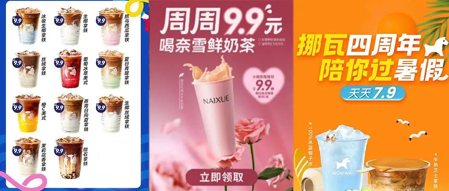 除了埋头奔跑在“甩卖”路上的卖家,餐饮界的茶饮、咖啡商家更是打得激烈。今夏8块8的库迪和9块9的瑞幸打得不可开交,蜜雪冰城旗下的「幸运咖」则以9.9元两杯的大折扣强势参战。这可让隔壁赛道的新茶饮蠢蠢欲动,奈雪的茶当即推出9.9元的月卡、喜茶推出100元喝10杯的活动……一下子几乎整个咖啡、茶饮市场都在积极迎战,连锁品牌们的价格战,搅动起一股“卷生卷死”的市场热浪,享受到低价的消费者左手咖啡,右手奶茶,内心狂喜“打得再激烈一点!”。
