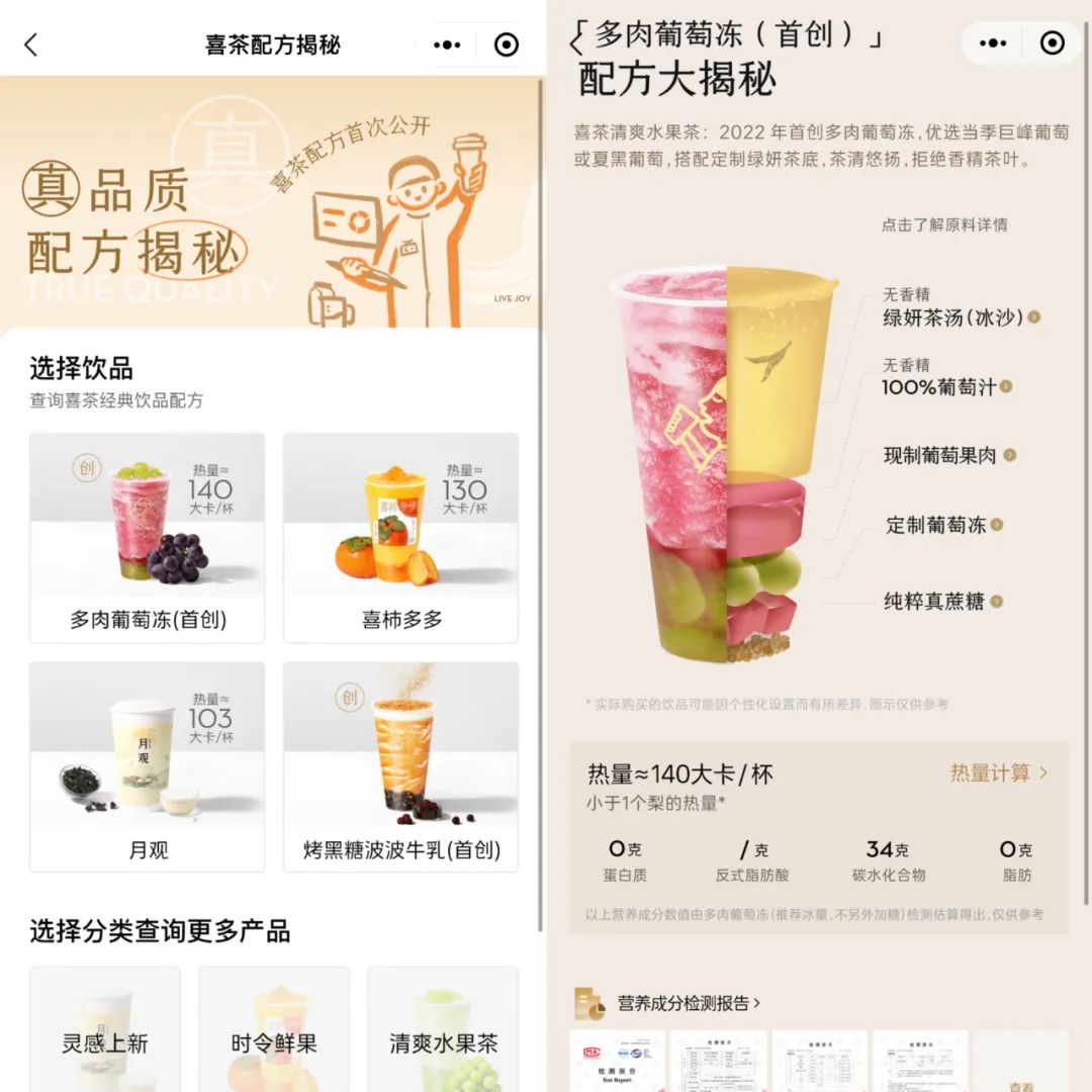 2023年10月26日,喜茶宣布将在行业内率先主动公开所有在售产品的配方原料、营养成分和真品质原料溯源信息。目前,喜茶已通过“喜茶GO”微信小程序公开了40多款产品的配方原料,涉及超40种真原茶、真水果、真牛乳、真蔗糖等原料溯源信息。通过对每一款原料的信息进行公开展示,喜茶让产品及原料品质透明且能追溯。