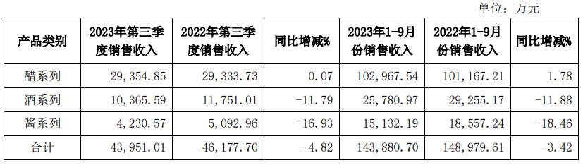 分单季度来看,恒顺醋业在首个季度就已出现增收降利的情形,第二季度营收、归母净利润则双双同比下滑13.88%、0.03%。第三季度归母净利润持续承压,实现营收约4.99亿元,同比增长0.03%;对应归母净利润约1469.75万元,同比下降44.61%。对于Q3利润水平的下滑,公司表示主要系产品销售结构变化导致毛利率降低所致。