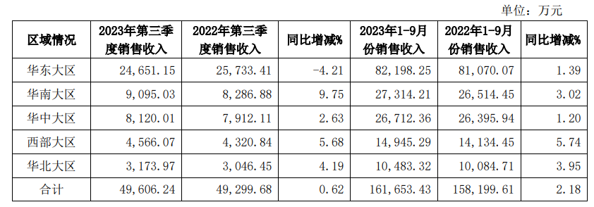 就销售区域而言,恒顺醋业的“大本营”华东大区仍然贡献着最大的营收比例,前三季度共录得营收8.22亿元,同比增长1.39%;西部大区实现了最快增长,同比涨幅为5.74%,录得营收1.49亿元;华北大区、华南大区、华中大区增速依次为3.95%、3.02%、1.2%。但从第三季度营收增速来看,华东大区是唯一增速为负的区域,其收入同比下滑幅度为4.21%。![]()