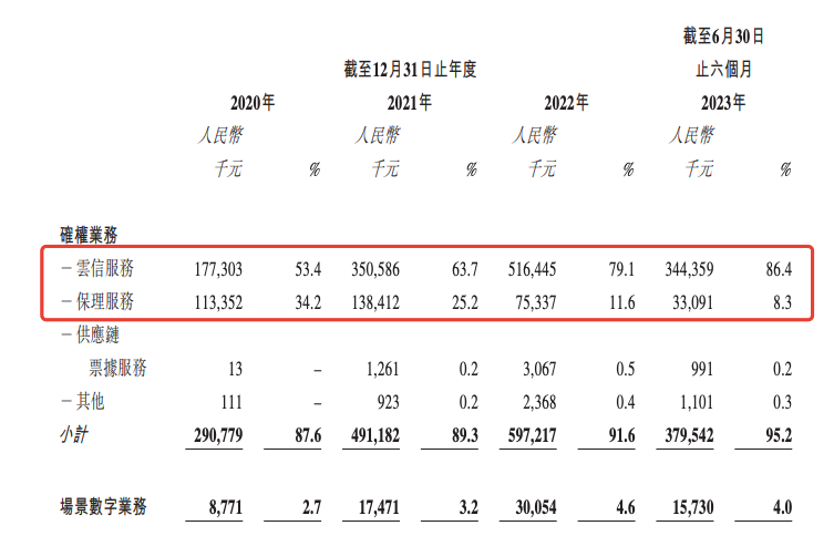 2020年至2023年上半年,云信服务收入占比分别为53.4%、63.7%、79.1%、86.4%,逐年上升;同时,保理服务收入占比分别为34.2%、25.2%、11.6%、8.3%,逐年下滑。