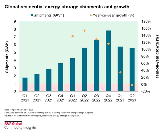 根据S&P Global Commodity Insights数据,2023年Q2,全球户用储能出货量较Q1下降了2%,这是户储有统计数据以来的第一次。