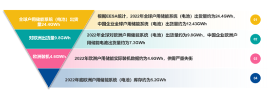根据国内产业机构EESA统计,2022年全球户用储能系统(电池)出货量约为24.4GWh,其中对欧洲户用储能市场出货量达到约9.8GWh;然而,2022年欧洲户用储能实际装机4.6GWh,仅2022年底欧洲户用储能系统(电池)库存约为5.2GWh。